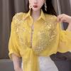 Cămașă coreeană de culoare solidă, elegantă, cu lanț de perle, pentru doamne de birou, vară nouă, cu volane cusute, chic feminină, cu nasturi pe un singur rând, guler polo, bluză