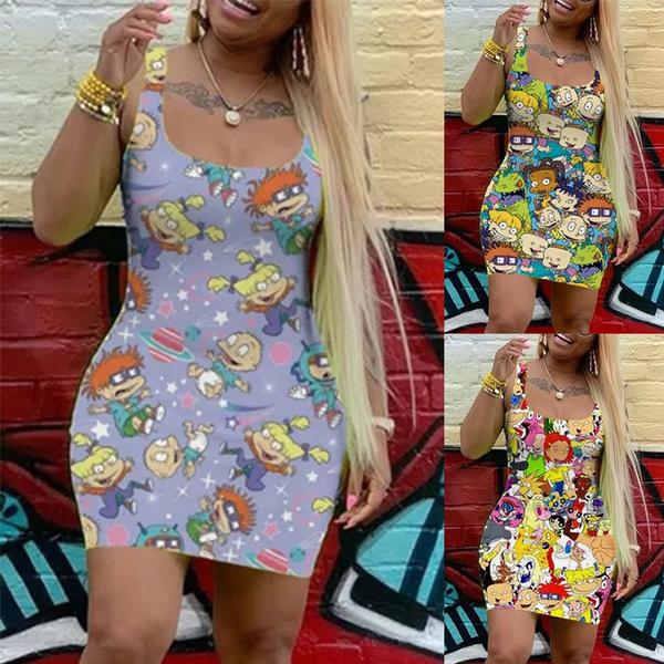 Women Ladies Rugrats Print Sexy Casual Printed Multicolor Vest Slim Dress