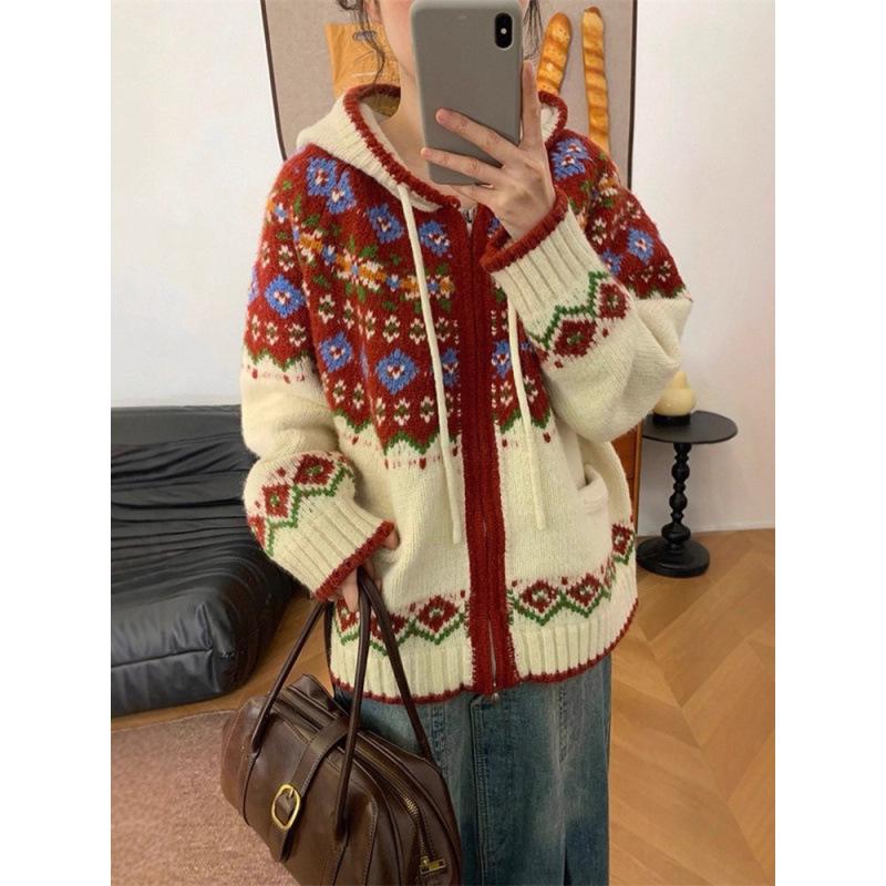 Women's Korean-Style Color Block Fair Isle Hooded Knit Cardigan - Autumn/Winter Versatile Loose Fit Sweater.