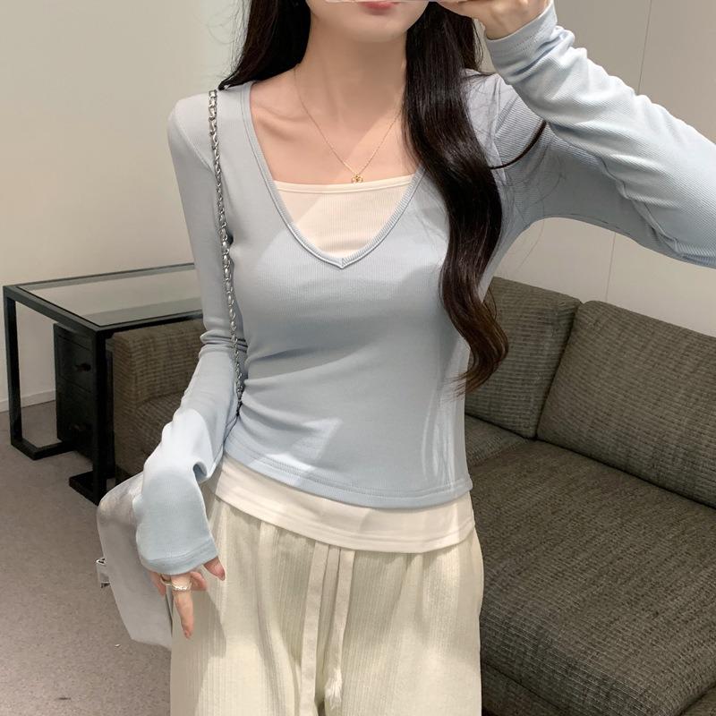 Spring new tight and thin chic white sky blue fake two-piece collar long-sleeved women's pure desire commuter top — cumpără ieftin în cadrul magazinului online Joom