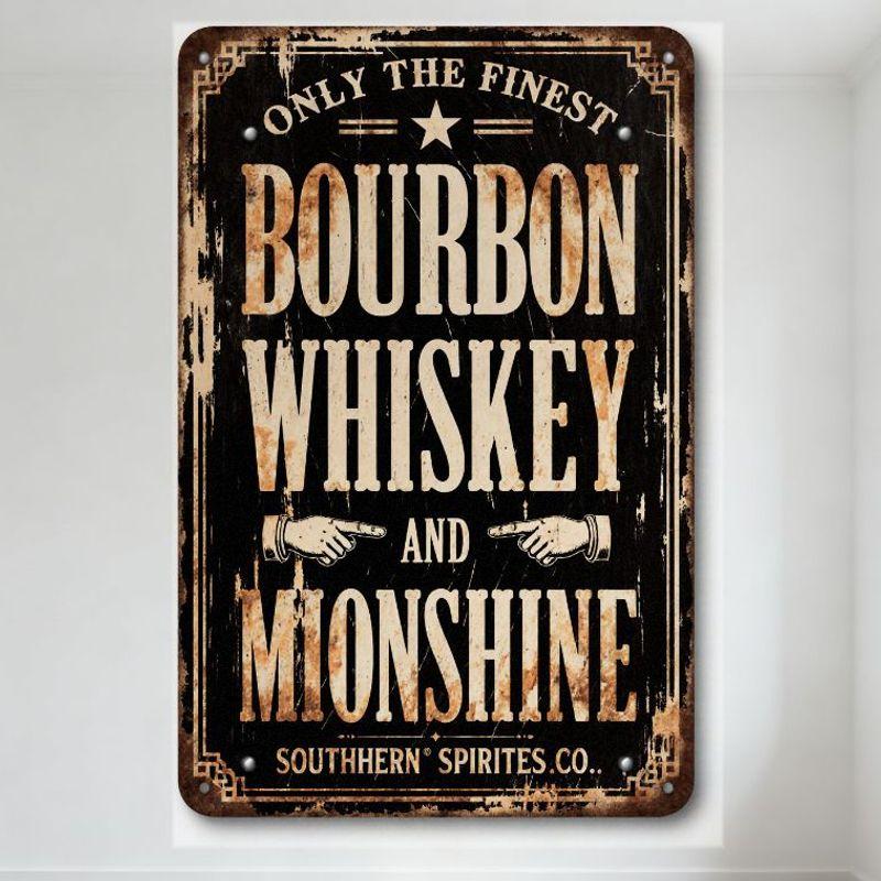 Vintage Southern Moonshine Bourbon Whiskey Metal Tin Sign, Distressed Black Background with White Text, Ornate Border, Man Cave