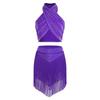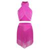 Ținută Dans Chacha Salsa pentru Femei Top Scurt Lucios Fronsat cu Gât Legat Fără Mâneci Spate Decoltat Fustă Stratificată cu Franjuri Pantaloni Scurți Incorporați