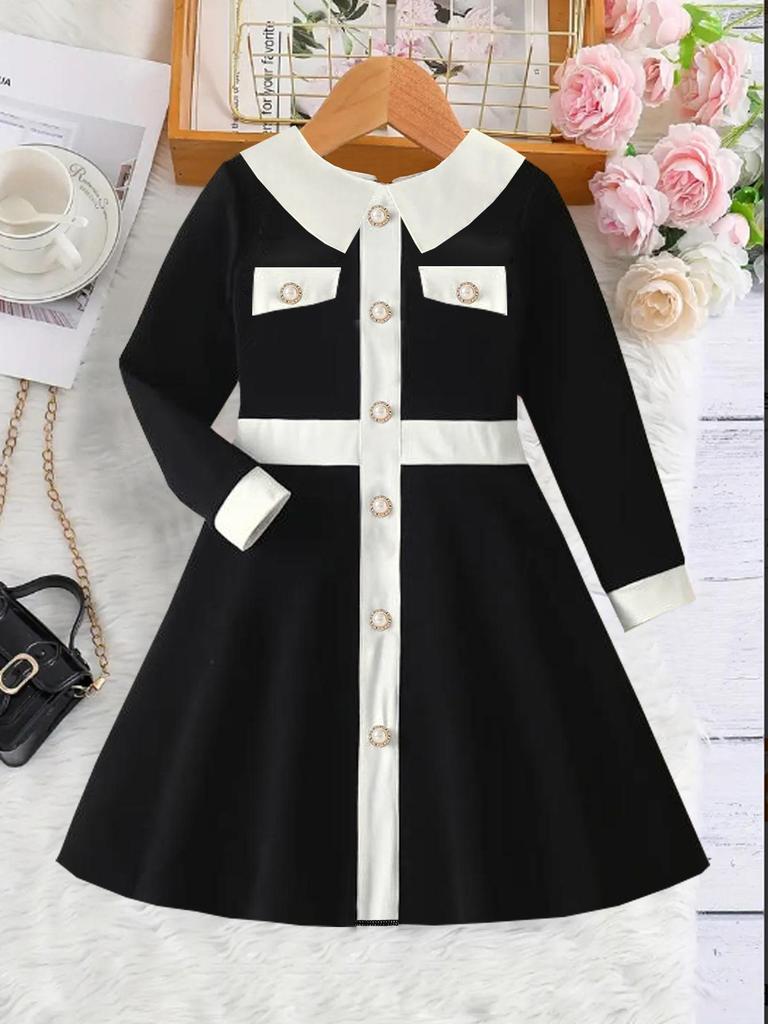 Girls' Black and White Long-Sleeve Knit Dress with Peter Pan Collar and Faux Pockets
