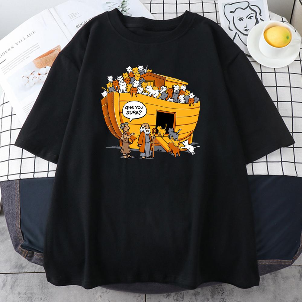 Cartoons Style Noah's Ark Cat Print Womens Tshirts Simple Oversize T-Shirts Fashion Loose Tops Soft Breathable T-Shirt for Women