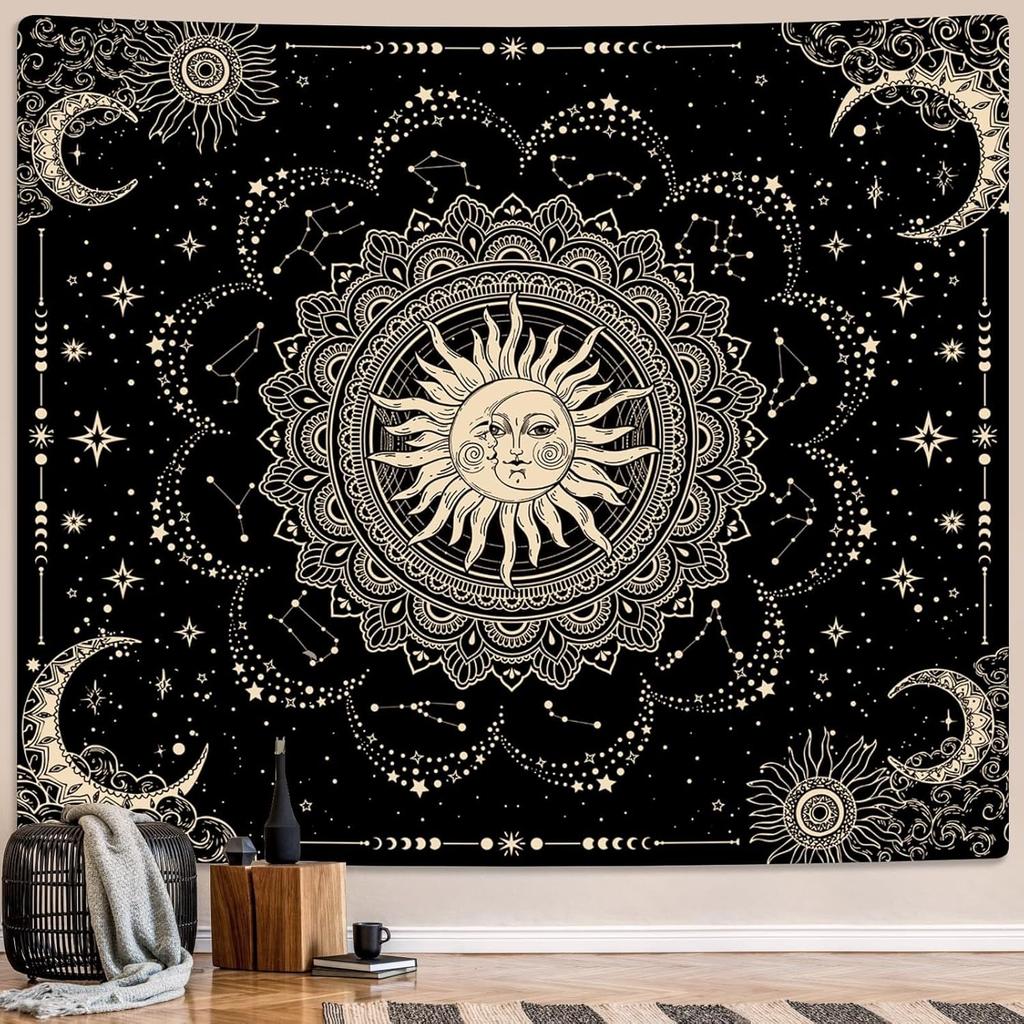 ARTCREATOR Sun and Moon Tapestry, Black Golden Mandala Tapestries Astrology Space Wall Hanging Boho Hippie Decor for Bedroom, Living Room, Ceiling