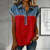 Denim Patchwork Shirts For Women Stand Collar Casual Blouse Short Sleeve Comfy Tshirt Spring Summer Fashion