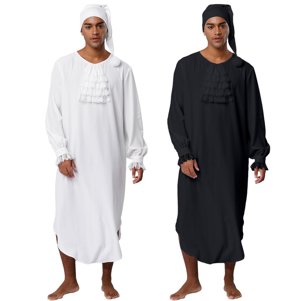 Mens Victorian Night Robe Fancy Dress Costume Long Sleeve Lace Trim Ruffles Collar Halloween Nightgown