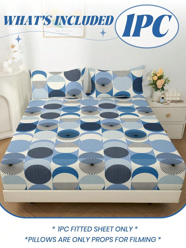 Gradient Blue Fitted Sheet Stylish Circle Plaid Pattern Printed Geometric Style Flat Sheet With 2 Pillowcases Modern Room Decor
