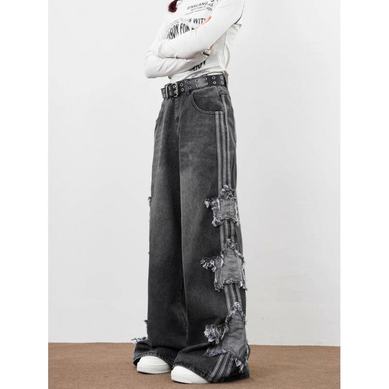 JYL Men's Wide-Leg Jeans American Star Patch Summer Loose Draped Floor-Length Denim