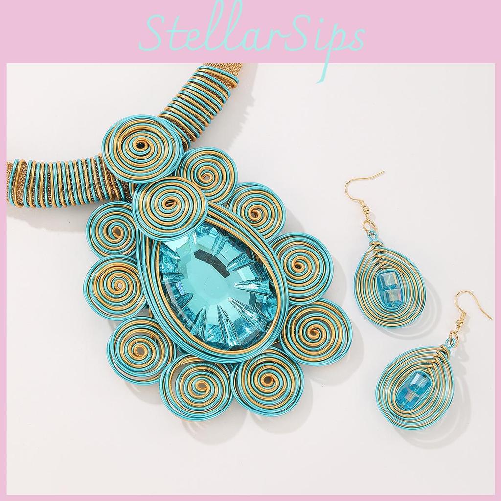 This jewelry set features a large, handcrafted necklace and matching earrings crafted from mixed materials with electroplated finishes. The necklace measures approximately 20 inches in length, with artificial crystal pendants featuring star, moon, cloud, and cosmic motifs in vibrant colors like gold, orange, silver, floral, and lake blue. The set supports versatile styling for both men and women, ideal for expressing individuality in fashionable accessories. Easy to maintain, wipe clean with a damp cloth for long-lasting brilliance.