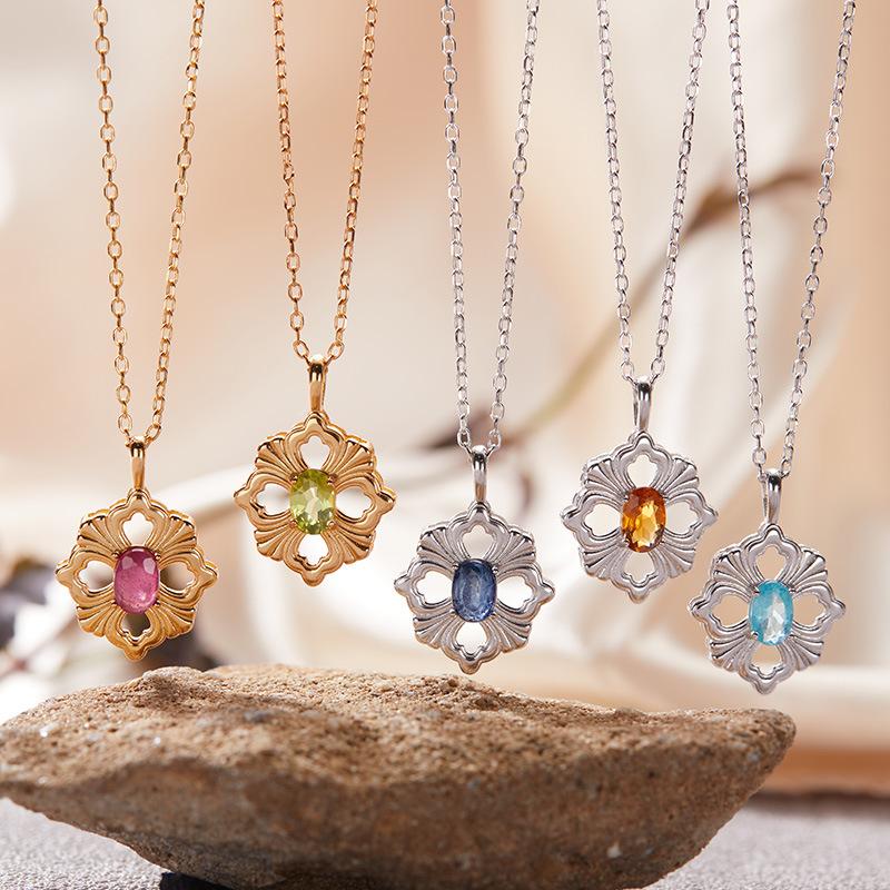 S925 Sterling Silver Natural Colored Treasure Necklace Women'S Niche Light Luxury High-End Set French Retro Brushed Collarbone Chain