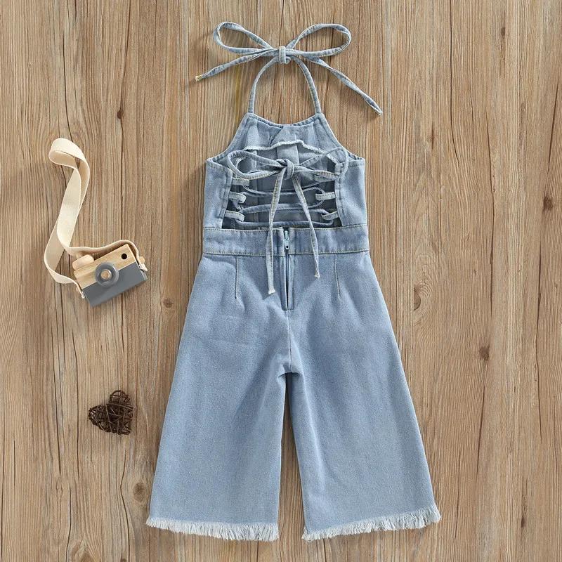 Kids Girls Denim Jumpsuit Tie Up Halter Neck Sleeveless Solid Blue Denim Long Playsuit For Girls