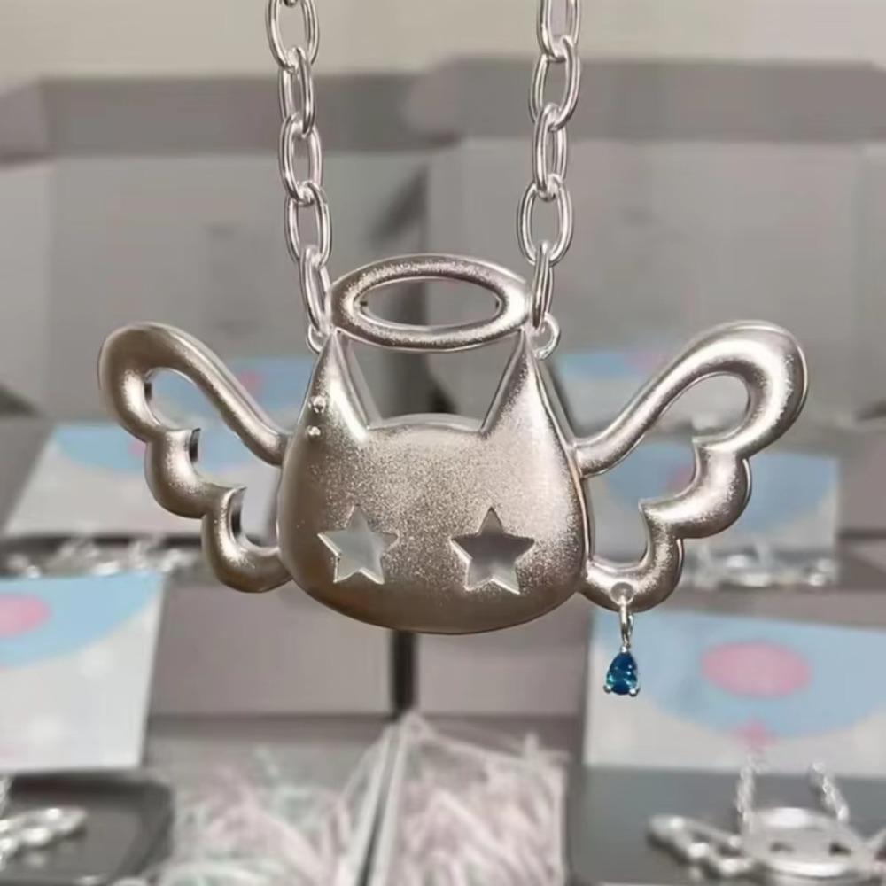 Silver Color Wing Cat Pendant Water Drop Necklace Punk Fashion Y2K Necklace Women Girls