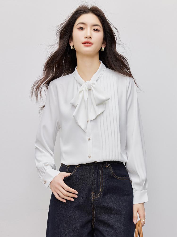 2026 New Women's White Bow Design Long Sleeve Fashion Shirt for Work