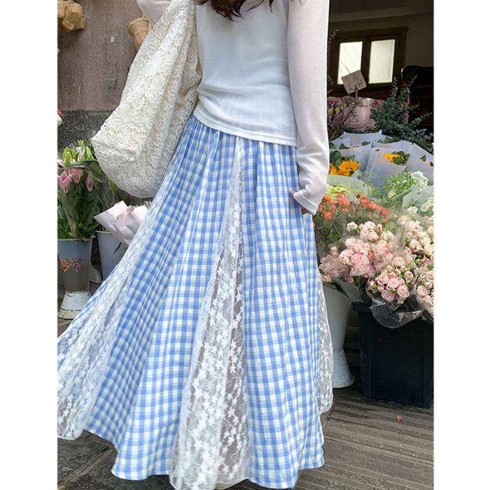 Zeng Xiaoxian Women's Irregular Blue Plaid Lace A-line Long Skirt: Summer 2025 Beachwear.