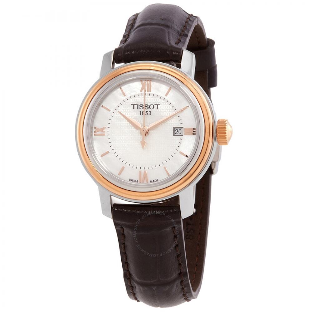 Stainless steel case with a brown leather strap. White mother of pearl dial with rose gold-tone hands and index-Roman hour markers. Date display at the 3 o'clock position. Quartz movement. Scratch resistant sapphire crystal. Solid case back. Case diameter: 29 mm. Round case shape. Buckle clasp. Water resistant at 50 meters / 165 feet. Functions: date, hour, minute, second. Watch label: Swiss Made. Tissot Bridgeport Quartz White Mother Of Pearl Dial Brown Leather Band Stainless Steel Case Ladies Watch T097.010.26.118.00.