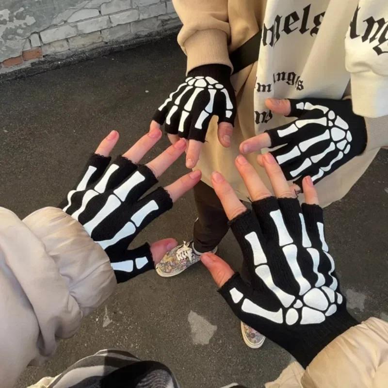 Punk Gloves Halloween Gloves Cosplay Y2k Skeleton Skull Half Finger Gloves Glow in The Dark Stretch Knitted Winter Mittens Adult
