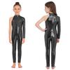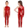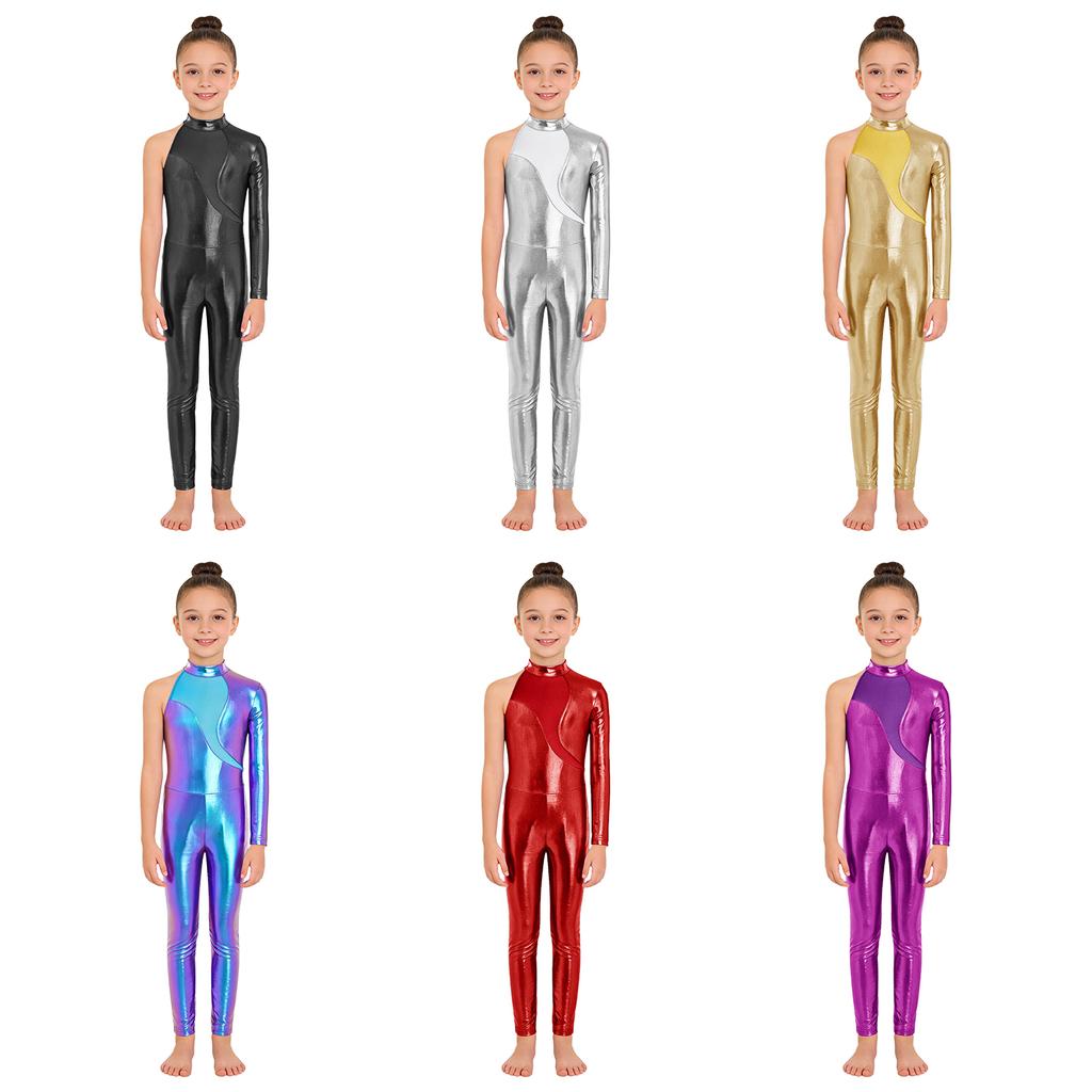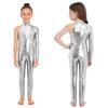 Girls Stage Performance Jumpsuit: Asymmetrical Metallic Mock Neck Mesh Patchwork Back Invisible Zipper Bodysuit Dancewear