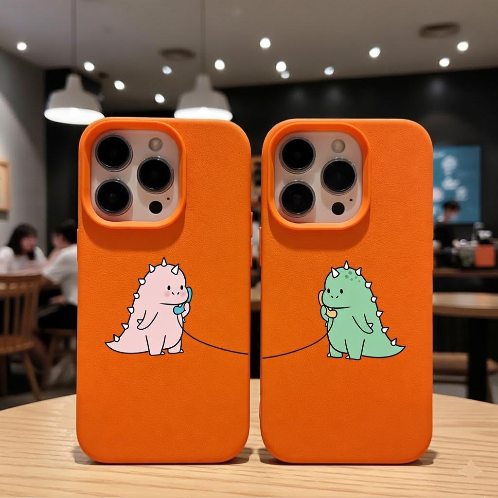 Adorable Talking Dinosaur Pair Couple Case For iPhone 17 Air 16 15 14 13 12 11 Pro Max Plus X Litchi Texture Protective Cover