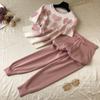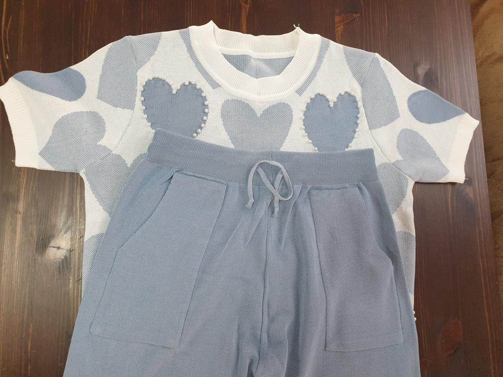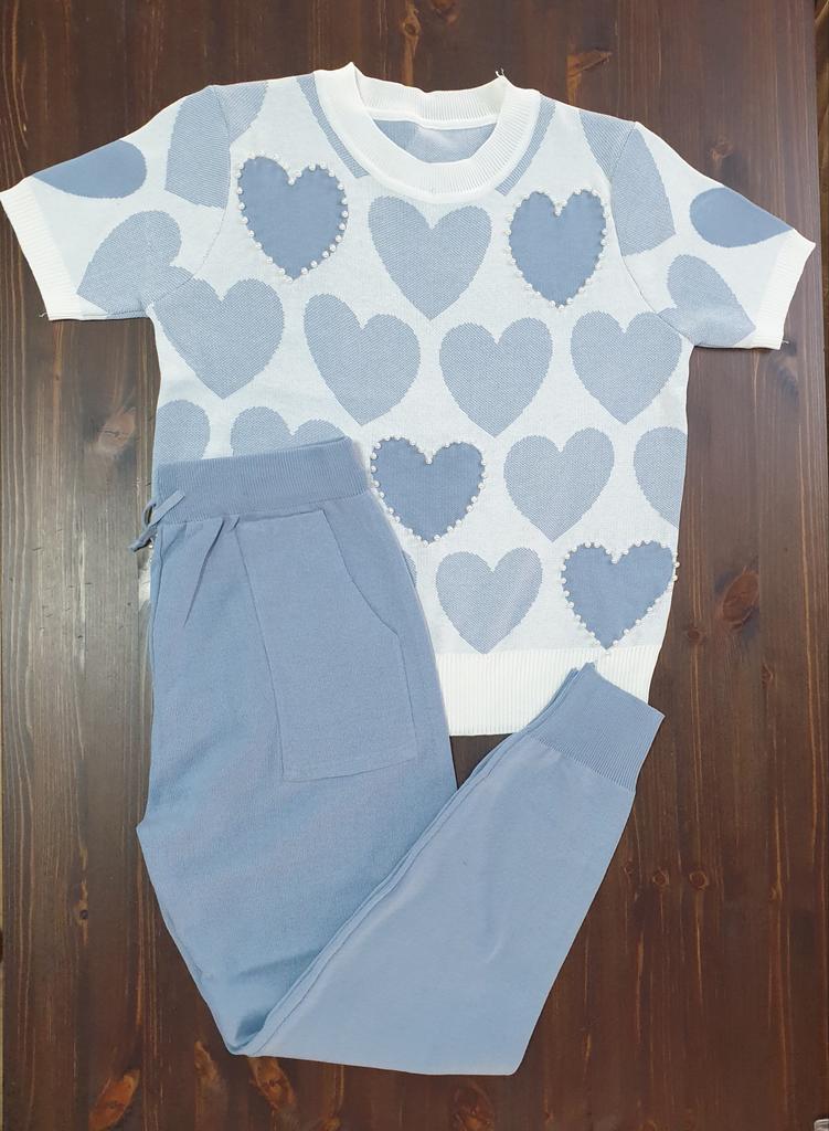 Faision Boncuklu Kalp Şekli Kısa Kollu Kazak + Elastik Bel Pantolon Kadın Tatlı 2 adet Takım Elbise Bayanlar Yaz Giyim Seti