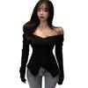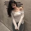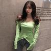 Kore Tarzı Uzun Kollu Düz Renk T Shirt Kadın Seksi V Yaka Bölünmüş Bayan Moda Rahat Üst Tee Gömlek