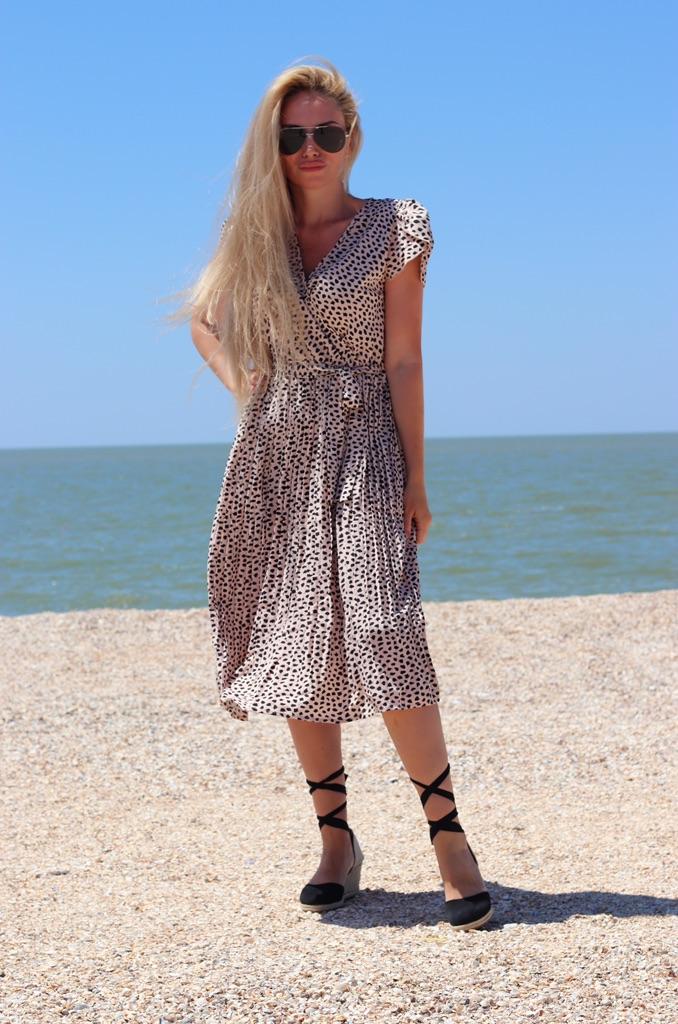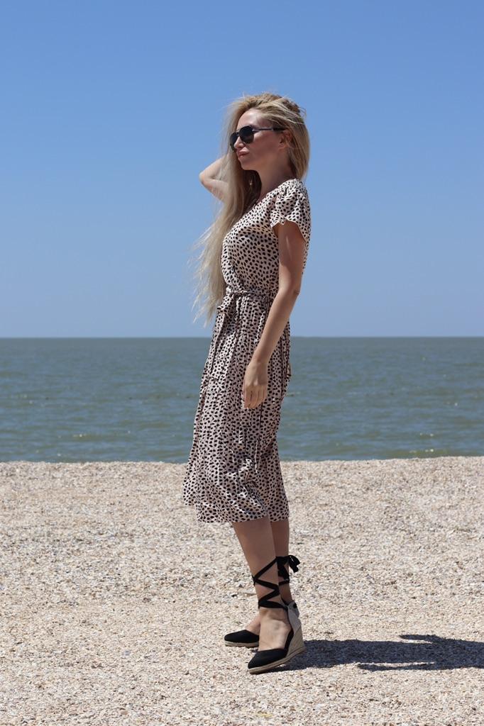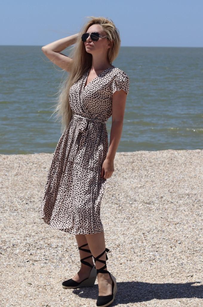 Yaz V Yaka Kısa Kollu Leopar Yüksek Bel Plaj Baskılı Uzun Elbise