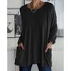 Kadın Rahat Bahar ve Yaz Cep Tunik Üst O-Boyun Gömlek Uzun Kollu Gömlek Moda Büyük Boy Gevşek Düz Renk T-Shirt