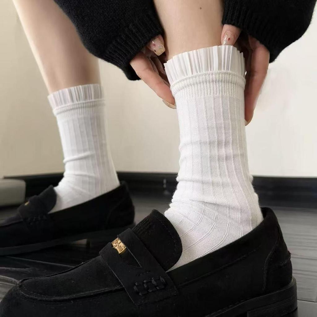 Miu Series Mary Jane Ballet Style Mid-Calf Double Needle Lace Socks for Women - Black & White, Versatile for Autumn & Spring. — tüm dünyaya ücretsiz teslimat ile online ürün satın alın!