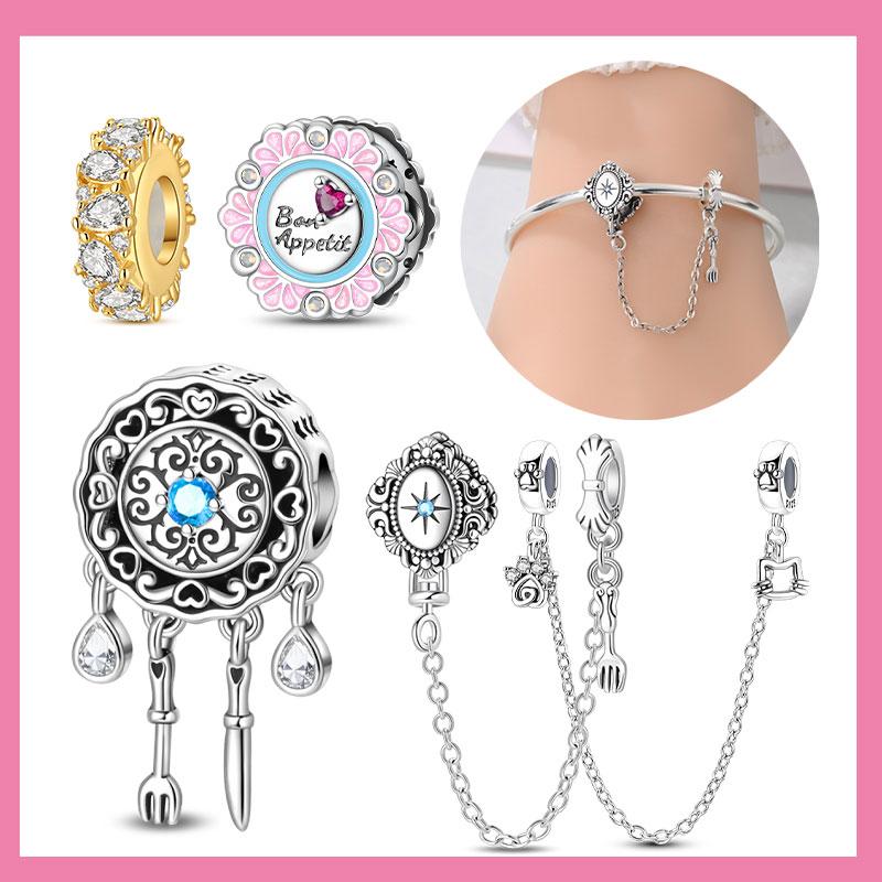 Copper Pink Tableware Fork Plate Security Chain Charms Beads Pendant For Original Bracelet Woman Girl Jewelry