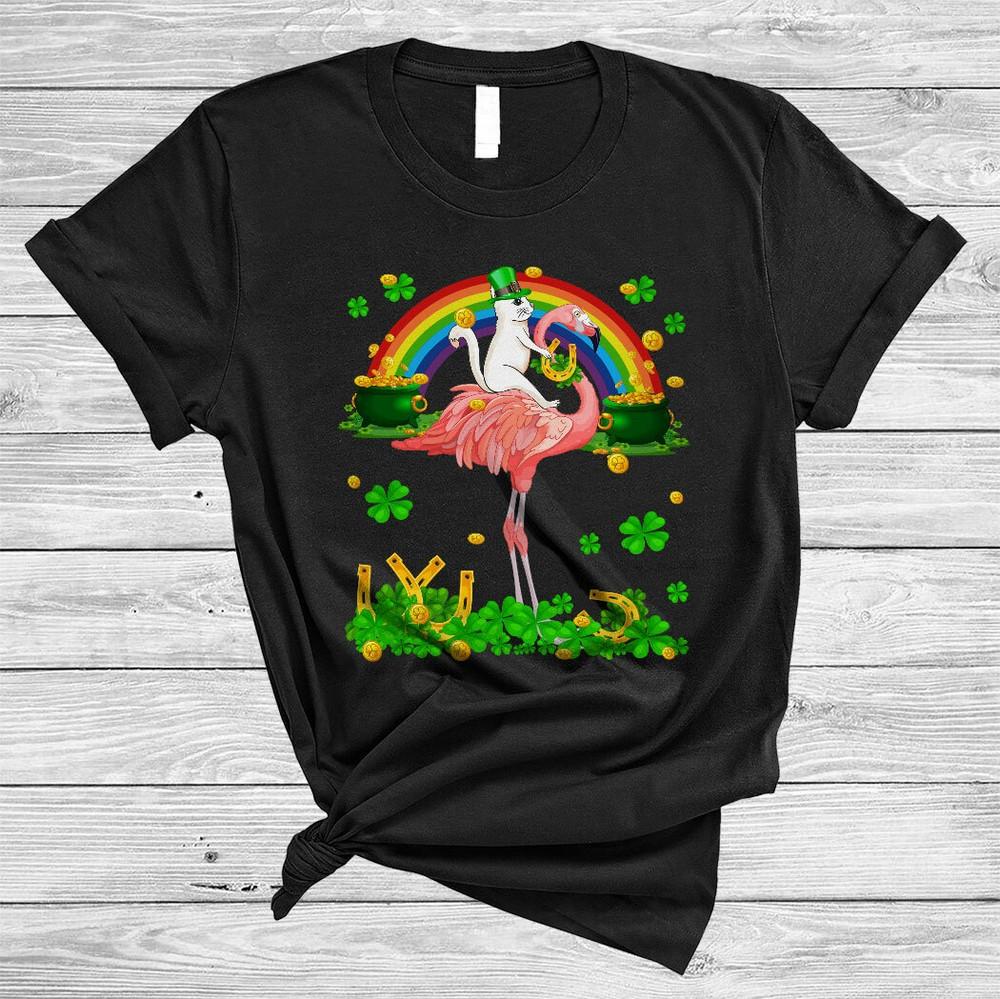 Leprechaun Cat Riding Flamingo Funny St. Patrick's Day Shamrock Rainbow T-Shirt