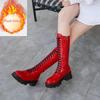 Fashion New Black Red Cross Strap Thick Soled Height Increasing Long Boots Autumn Winter Fashion Plush Warm Women Knee High Boots 34-43