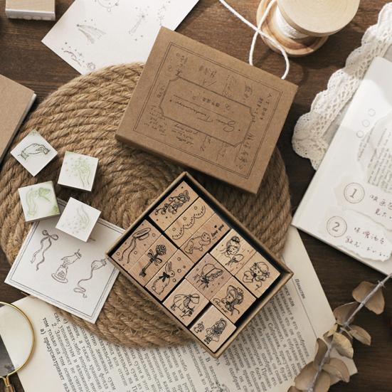 12 Pcs Vintage Wood Rubber Stamp Universe Letters Number Flowers Retro Stamp Set for DIY Art Craft Journals Scrapbooking Planner Card Making