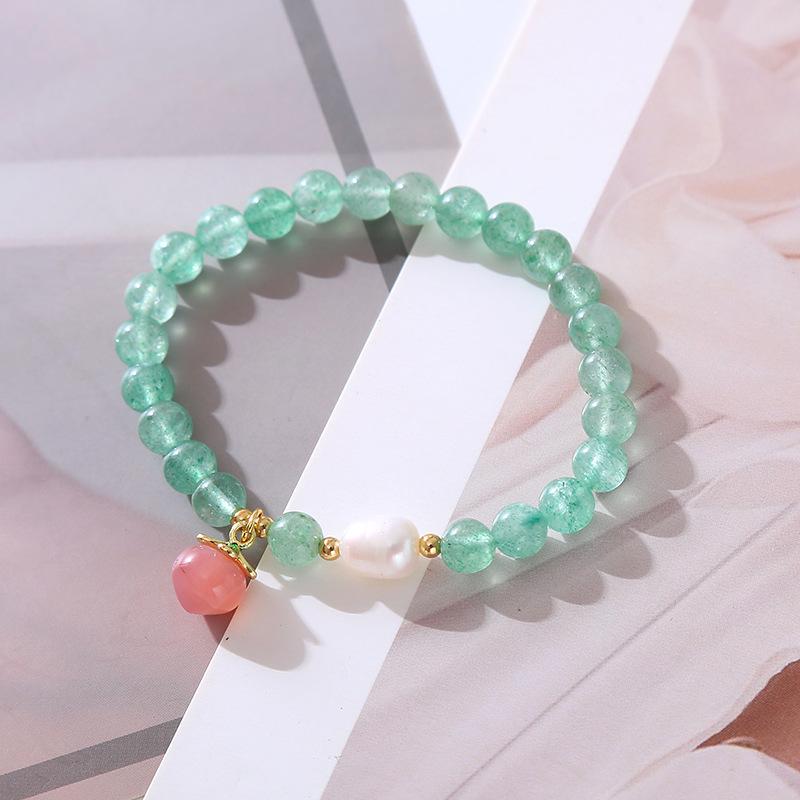 100% Natural Freshwater Pearl & Green Chalcedony & Strawberry Quartz Trendy Peach 14K Gold Filled Ladies Beads Chain Bracelet