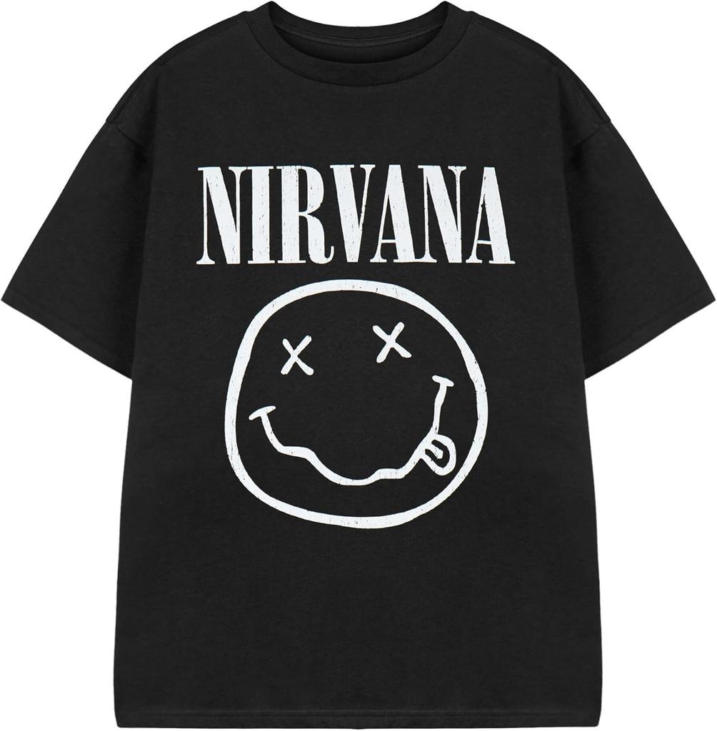 Nirvana Kids T-Shirt _ Boys & Girls Short Sleeve Graphic Tee in Black Classic Grunge Distressed Band Logo Print Apparel Top