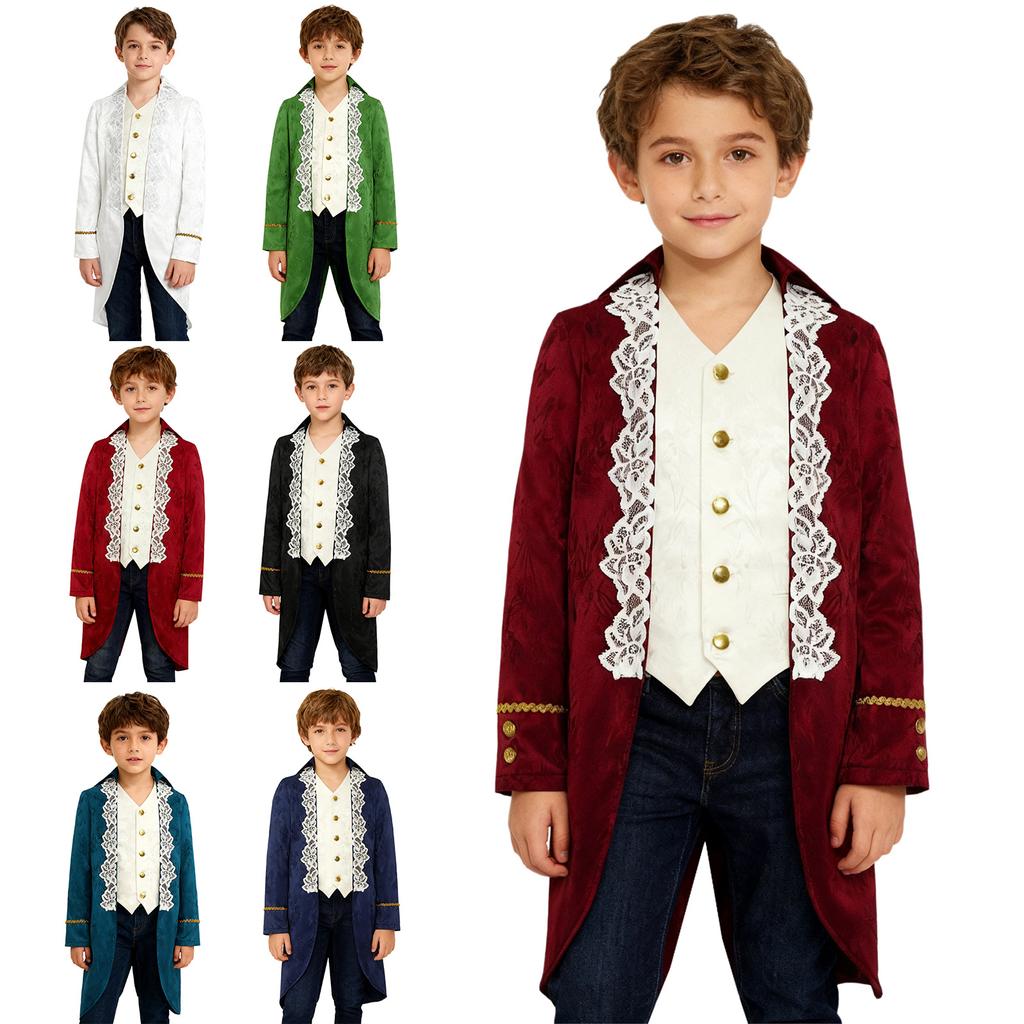 Boys Medieval Renaissance Victorian Jacket Turn Down Collar Long Sleeves Fake Two in One Lace Embroidery Tailcoat