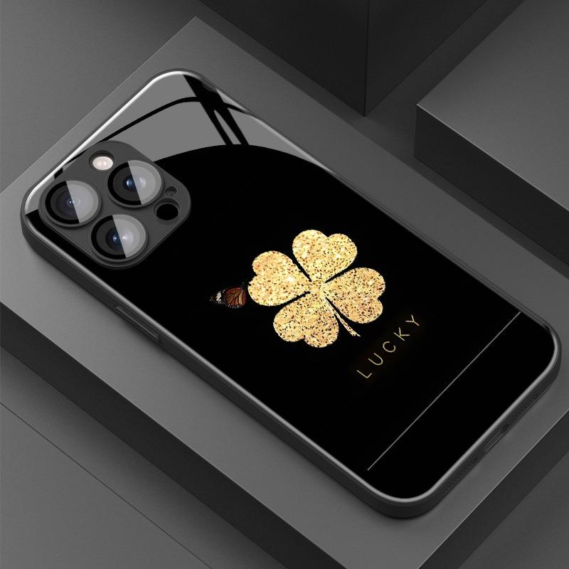 Minimalist Golden Lucky Clover Pattern Glass Phone Case For iPhone 17 16 15 14 Pro Max 13 12 11 17Air 16E 7 8 Plus XR XS X Cover