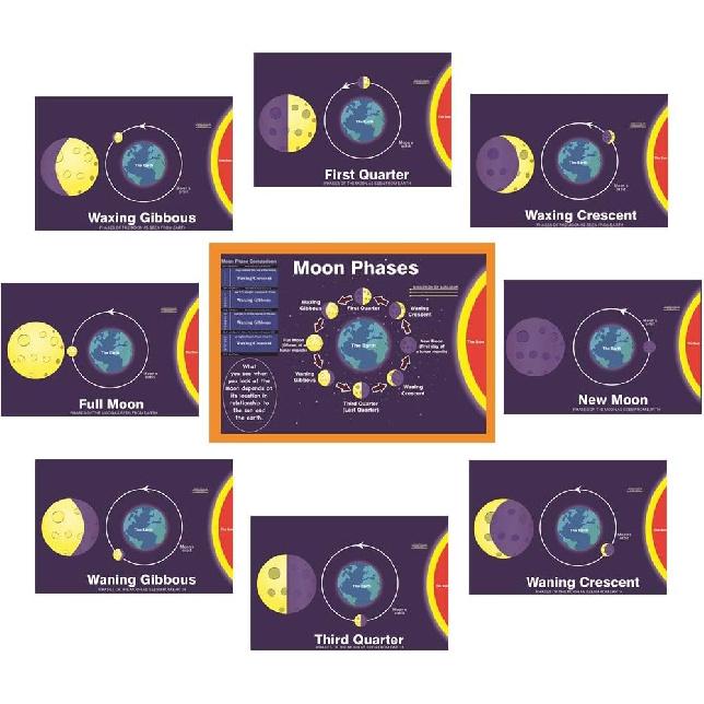 【9 Moon Phases Posters Complete Combination】Contain - New Moon, Waxing Crescent, First Quarter, Waxing Gibbous, Full Moon, Waning Gibbous, Third Quarter, Waning Crescent. The set of 9 Moon Phases posters are specifically designed to help students gain a greater understanding of moon phases topics.