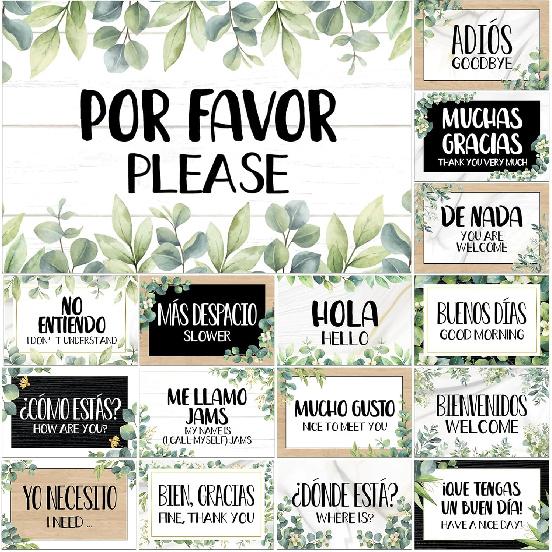 gisgfim 16 Pcs Spanish Words and Phrases Poster Set Spanish Phrases Bulletin Board Study Spanish Classroom Decoration for Teachers Preschool School