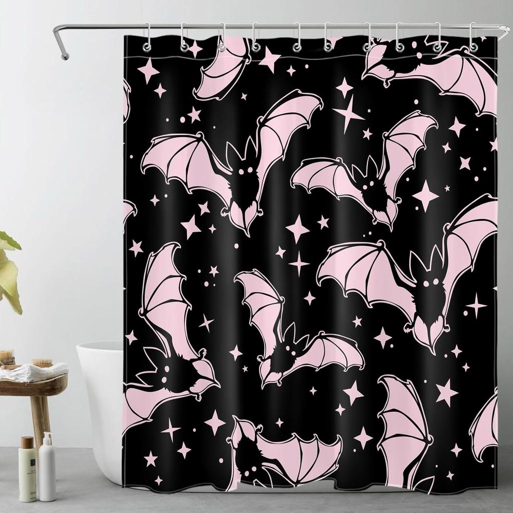 LB Spooky Halloween Shower Curtain for Bathroom, Gothic Horror Halloween Pink and Black Bats Fabric Shower Curtain with Hooks, Funny Pink Bat
