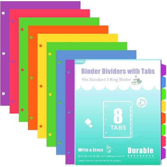 3 Ring Binder Dividers with Tabs - 8-Tab Colorful Plastic Page Dividers for Letter Size (8.5x11), izable Index Tabs, 3 Sets | Reble Rainbow Binder