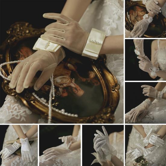 Exquisite Style & Detailing: Combining classic elegance with modern simplicity, these bridal gloves showcase intricate lace patterns, faux pearl embellishments, delicate bows, and mesh hollow craftsmanship. Some styles feature three-dimensional bows or faux pearl buttons at the wrist to add depth and sophistication. The blend of transparent tulle and matte satin highlights fine handcrafted artistry that complements diverse bridal tastes.