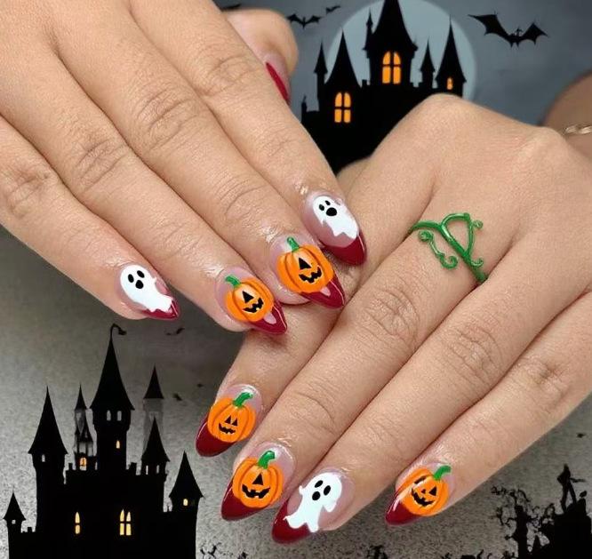 Hot-selling manicure small fresh and cute Halloween French pumpkin ghost long almond wear armor