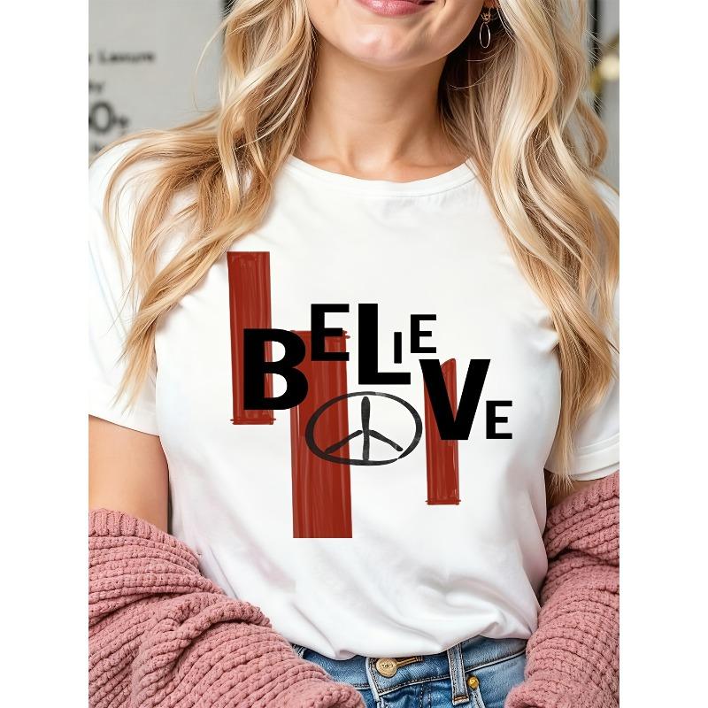 European Size BELIEVE Text Bold Black Letters Red Brush Strokes Peace Symbol Clean Design for Women Summer Short-sleeved Printed T-shirt — tüm dünyaya ücretsiz teslimat ile online ürün satın alın!