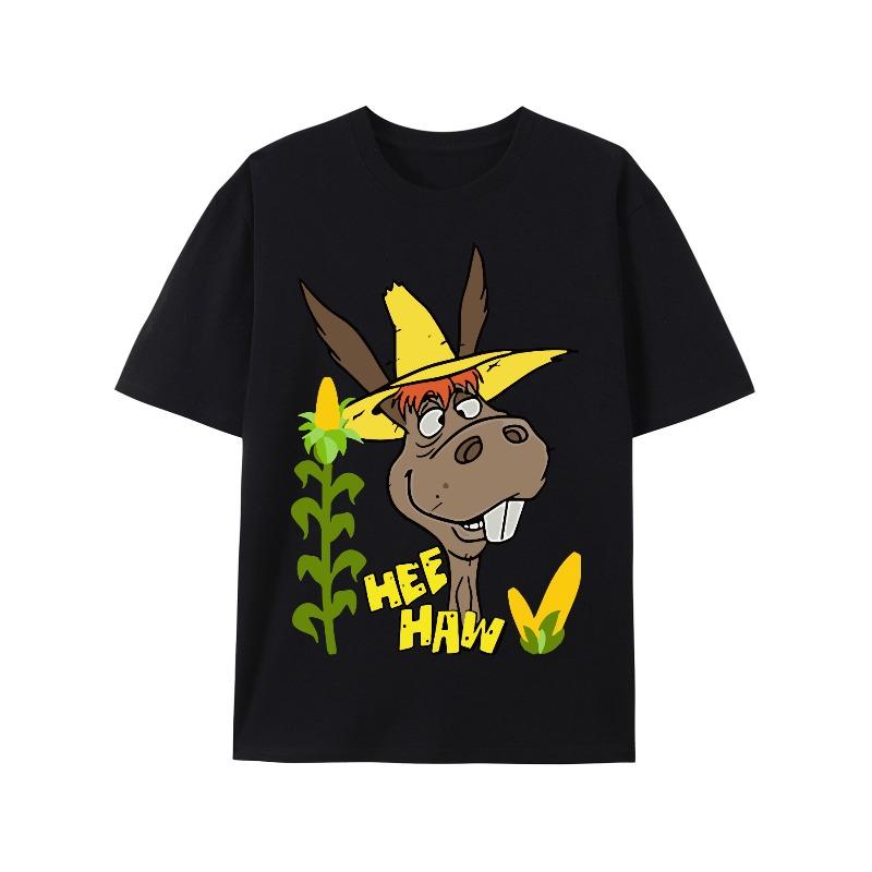 European sizes T-shirt with a Donkey Wearing a Yellow Hat and Corn Plants, Text Reads 'Hey Ho', All-season Casual Wear, Comfortable Clothing Y1-3