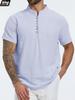 Summer New Men's Cotton Linen T-shirt Short Sleeve Breathable Lightweight Solid Color Male Fashion Henley Neck Button Top — tüm dünyaya ücretsiz teslimat ile online ürün satın alın!