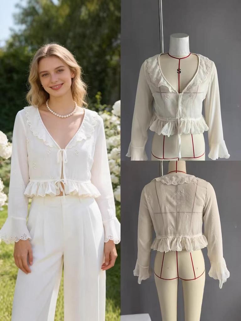 European & American Style Women's Chiffon Shirt with French Lace-up Waist, Embroidered Ruffles, and Long Sleeves — tüm dünyaya ücretsiz teslimat ile online ürün satın alın!