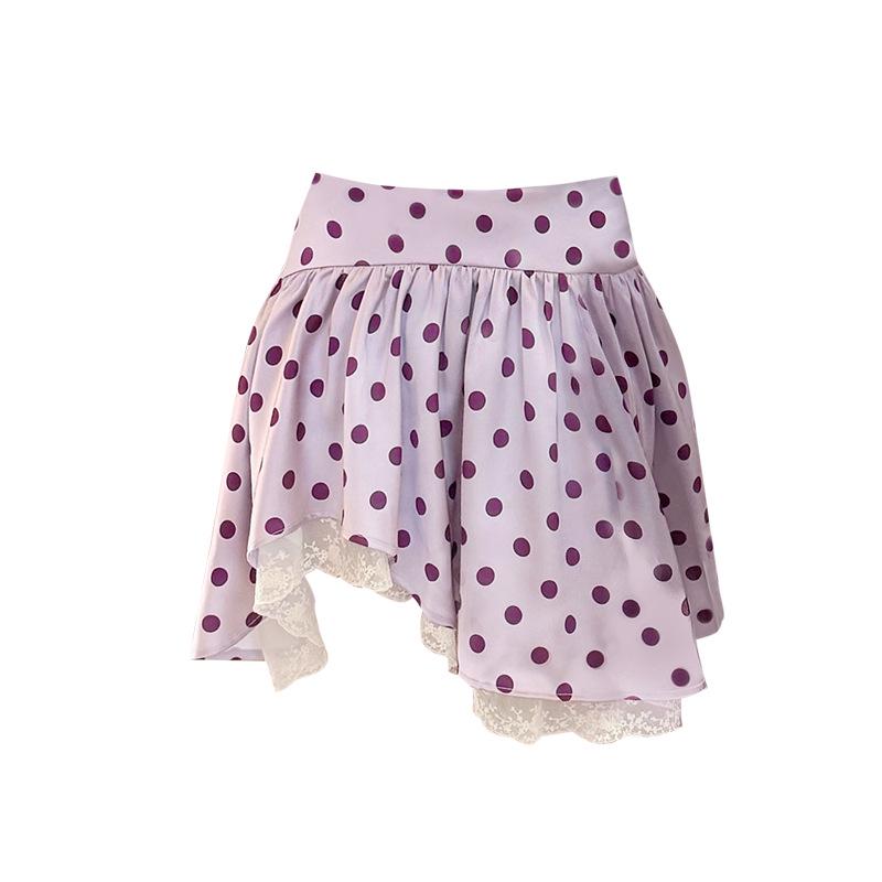 French Polka Dot Lace Patchwork Irregular Purple Midi Satin Skirt for Early Autumn