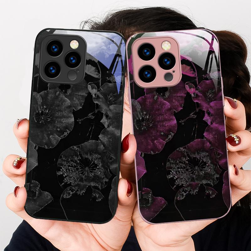 Light luxury lotus leaf For iPhone 16 E 15 14 13 Plus 12 mini 11 Pro Max XR Xs Max X 7 8 P lus 6 6S 22 Tempered Glass Phone Case