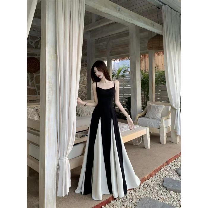 Women's Summer French Patchwork Color Block Spaghetti Strap Waist-Cinching A-Line Floor-Length Dress