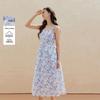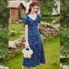 Women's Blue Floral French Style Slimming Summer Dress with Waist-Cinching Design